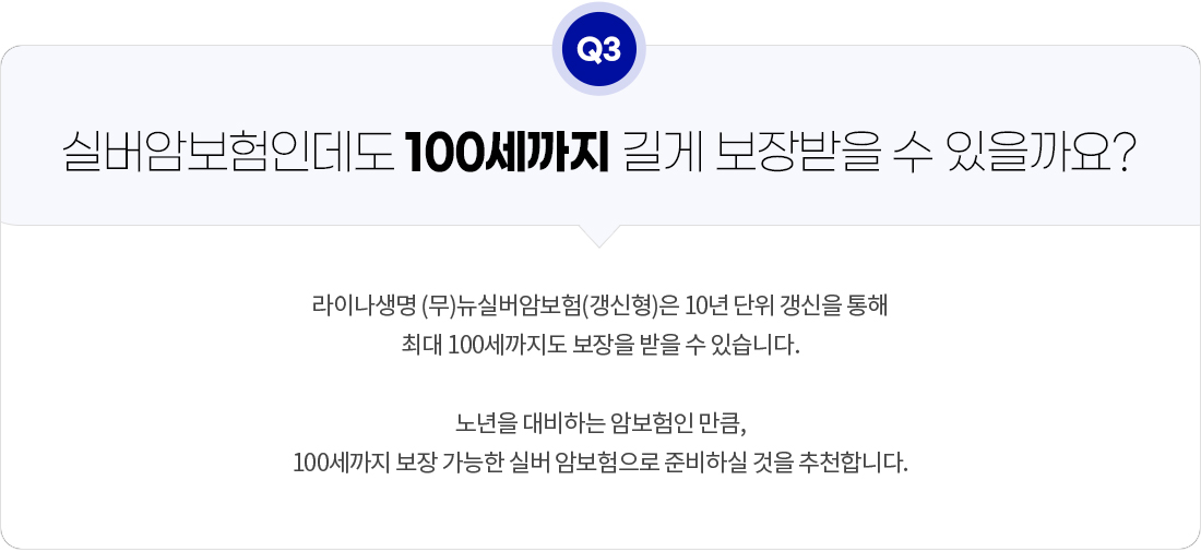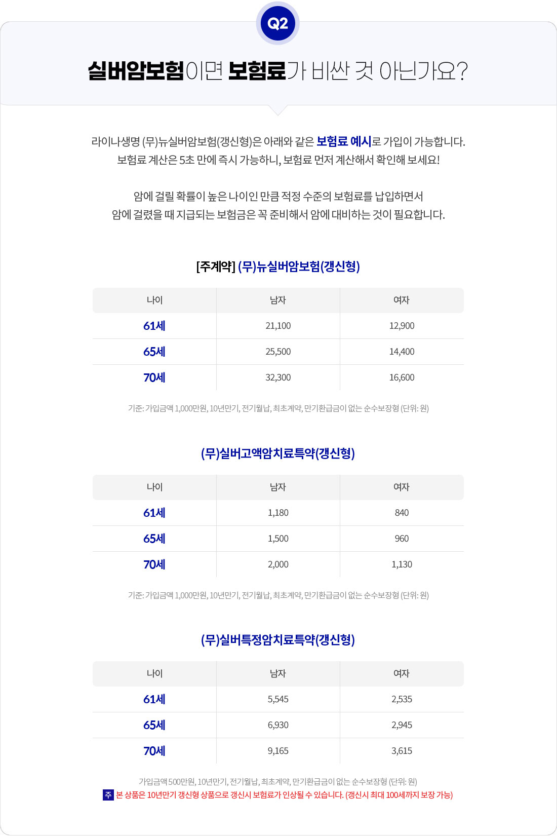 - 본 상품은 10년만기 갱신형 상품으로 갱신시 보험료가 인상될 수 있습니다. (갱신시 최대 100세까지 보장 가능)